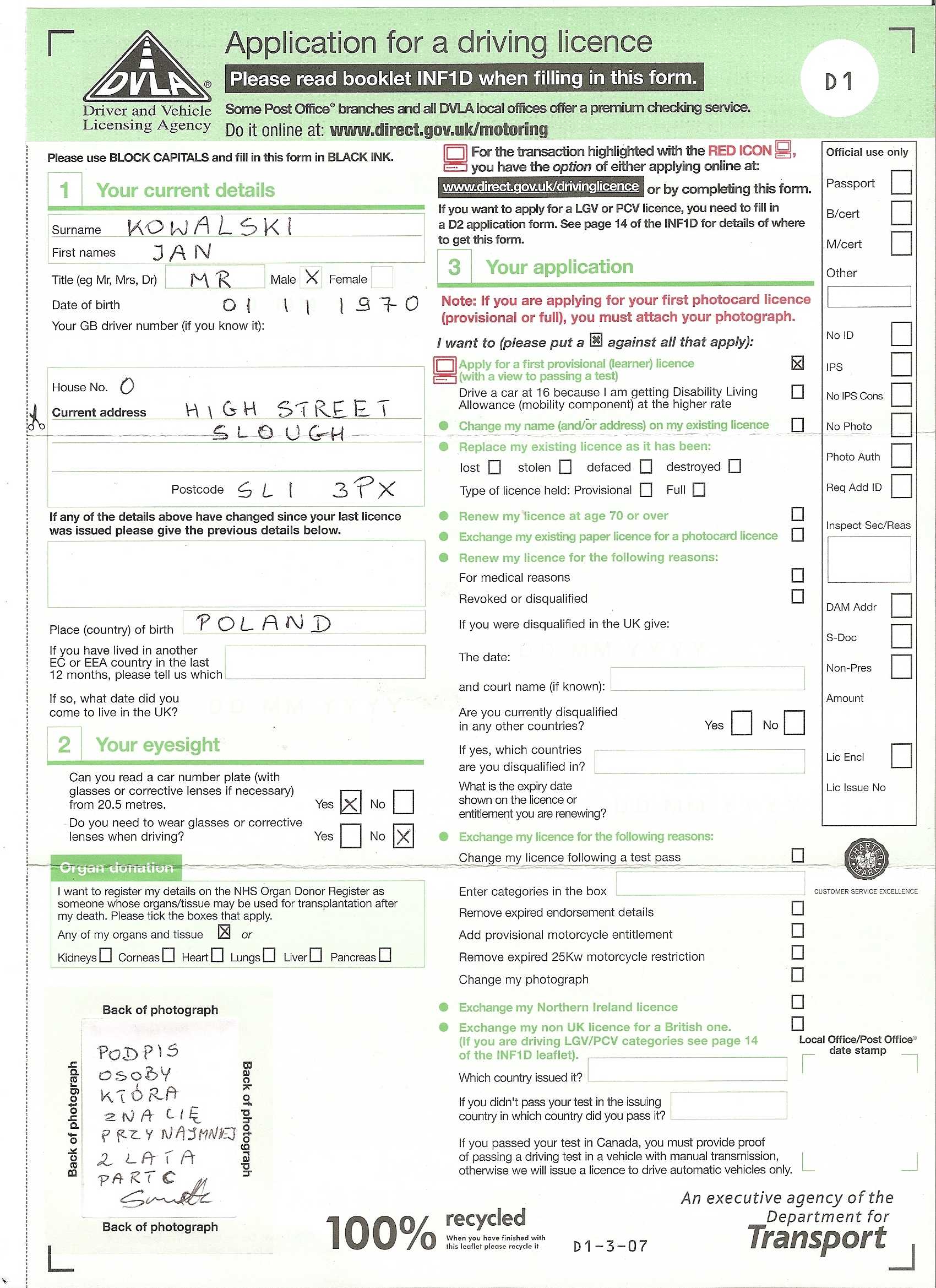 10 lat (zobacz formularz, strona 1, strona 2)". Aby uzyskać PROVISIONAL DRIVING LICENCE ( koszt 50£) należy